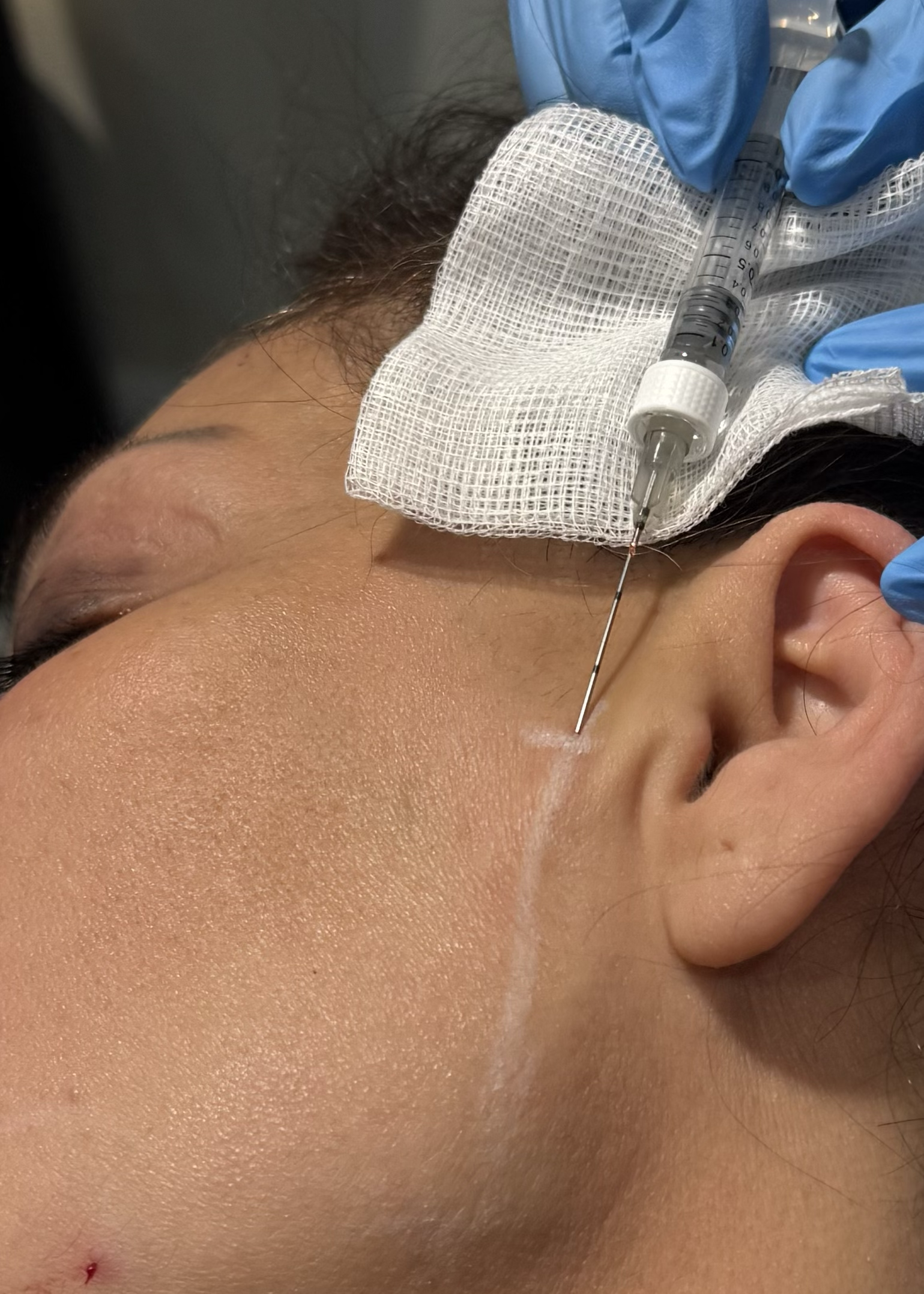 Botox 3 Areas: Frown line injection sites marked out with blebs visible where botox has been injected. Forehead botox injections ongoing.